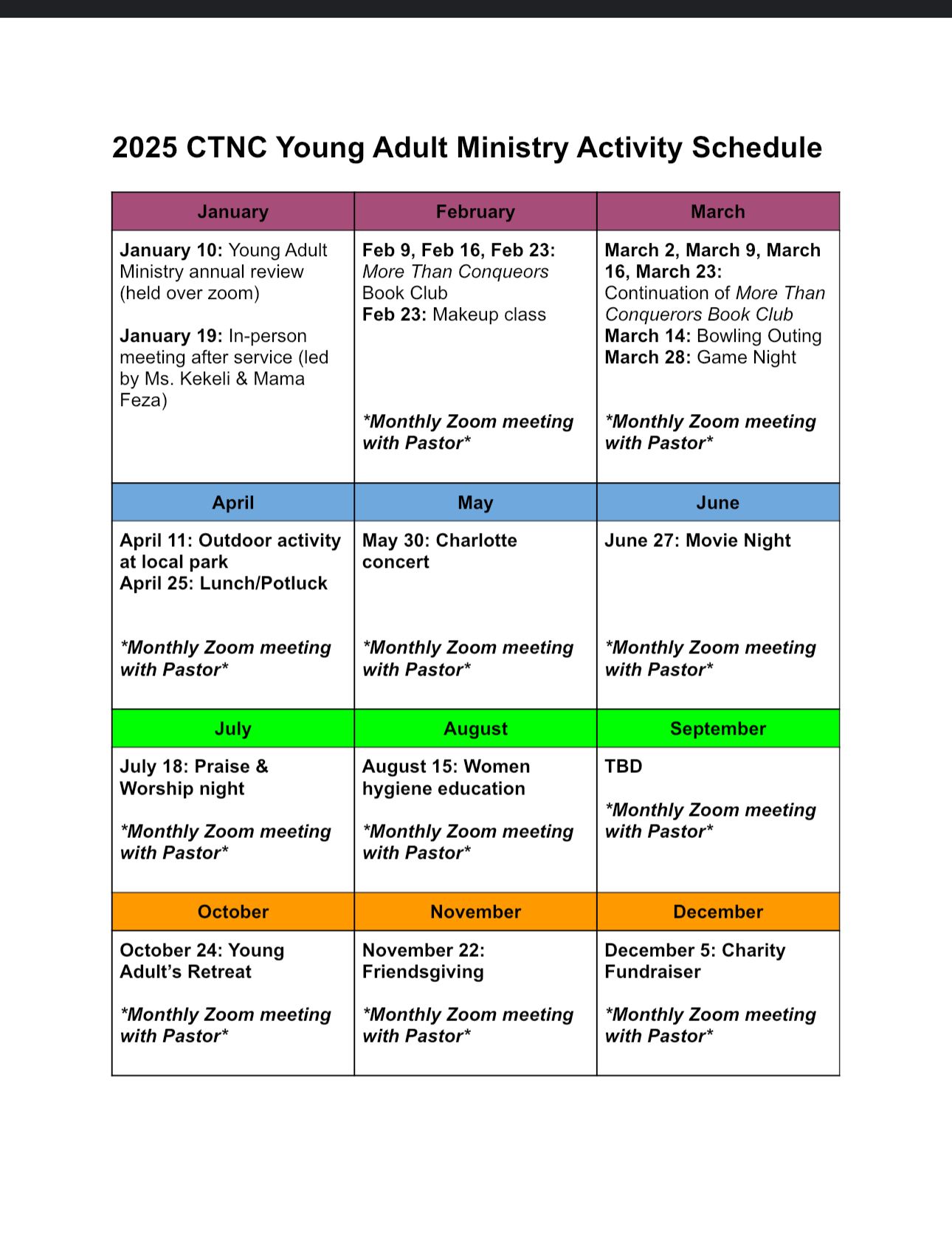 This year, we are introducing a Book Club, meeting once a month over Zoom. We will be reading and discussing our Pastor’s fourth book, “More Than Conquerors.” This will be an opportunity to grow spiritually and gain deeper insights into our faith while engaging in meaningful conversations with fellow members.